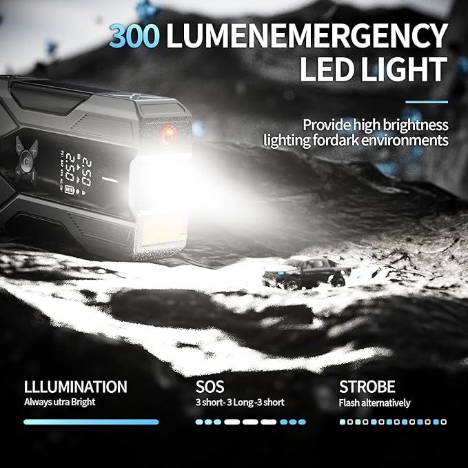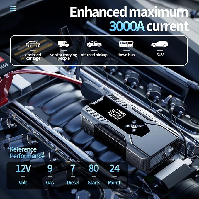 - 【Powerful Dead Battery Rescue】:Instantly restart vehicles with our high-output 3000A peak portable car jump starter. Safely jump gasoline engines up to 9L and diesel engines up to 7L in seconds, even with completely dead batteries. Get back on the road fast, no waiting for roadside assistance.