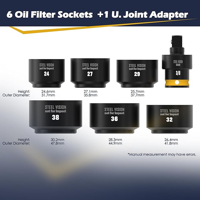 - [Comprehensive Compatibility – Fits 24mm to 38mm Oil & Fuel Filters] Includes 7 metric sockets (24mm, 27mm, 29mm, 32mm, 36mm, 38mm, and a U-joint) designed to fit cartridge-style oil filter housings found in Ford F250 6.0/6.4, BMW, Mini, Audi, VW, Volvo, Porsche, and even some Duramax fuel filter systems. A must-have for oil and fuel filter changes across multiple vehicle types.