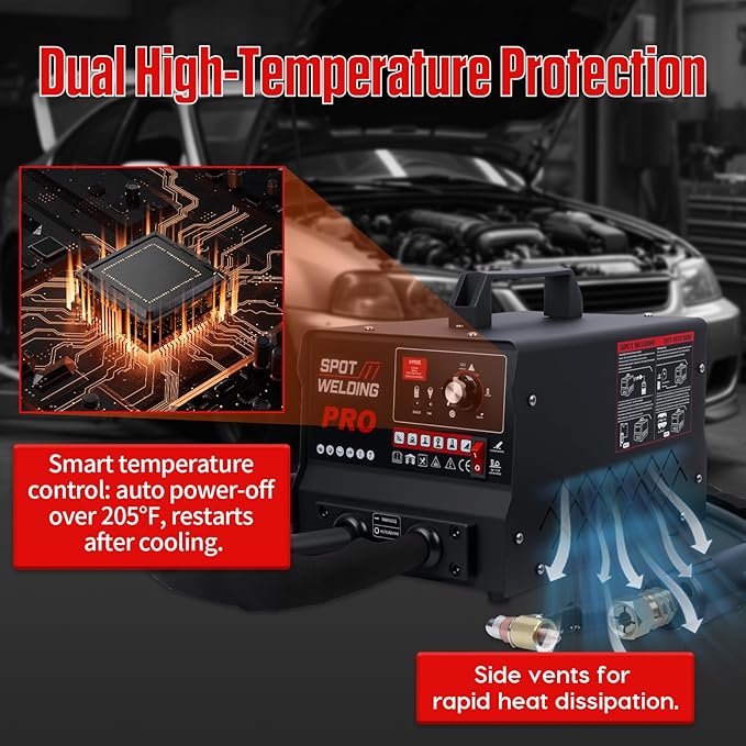 - 【Overheat Protection】 The spot welder dent puller features automatic overheat protection: the spot welder shuts off when the transformer reaches 95°C, restarting automatically after cooling to prevent potential short circuits and machine damage.