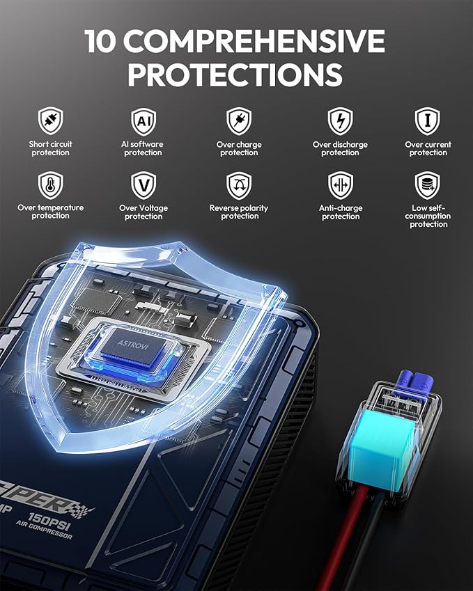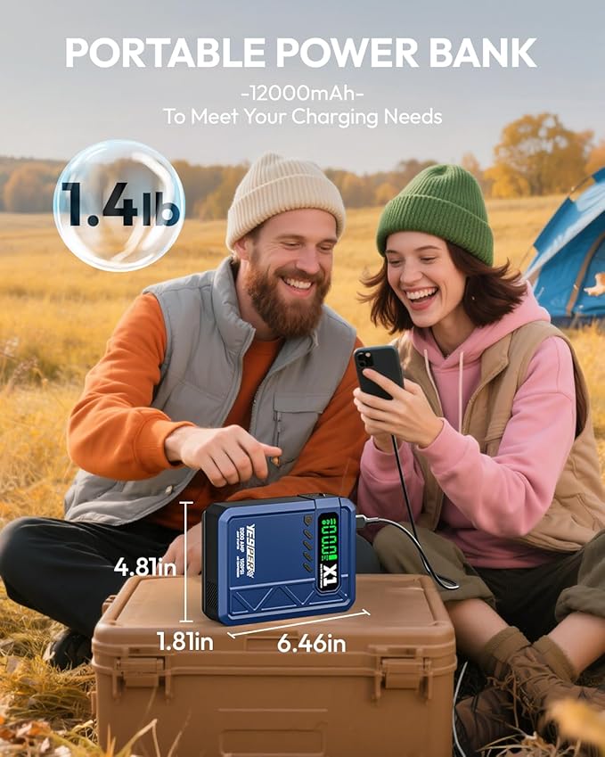 - Powerful Car Battery Jump Starter: YESPER X1 portable jump starter with air compressor adopts QDSP technology to increase the starting capacity by 3 times. Through the disruptive innovation of battery/component structure, the car battery jump starter reduces the starting temperature and equalizes the temperature to ensure safe starting