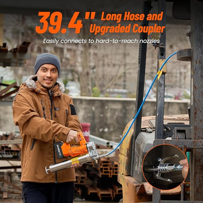 - Quick-Release Coupler & 39.4" Long Hose – Reach Every Grease Point with Ease: This grease gun includes an enhanced quick-release coupler for secure connection and easy disassembly—even under pressure. The 39.4-inch flexible hose ensures precise access to tight or hard-to-reach fittings, whether working beneath vehicles, near wheel assemblies, or servicing large machinery in workshops or outdoor settings.