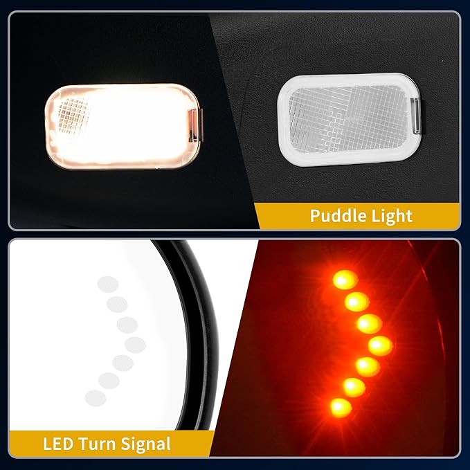 - Advanced Functionality: Power-adjustable plane mirror for customized visibility. With LED arrow signal lights, puddle light and manual folding, this side mirrors can enhance your driving experience