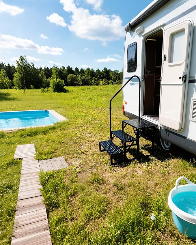 - 【Safer Porch Steps】: Our portable pool steps are a better option for people with Parkinson's disease, balance issues, poor knee support, disability, and the use of walking sticks. Steps for RV support enhances safety and functionality when entering and exiting motorhomes, travel trailers, hot tubs, and motorhomes