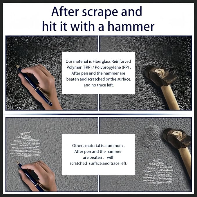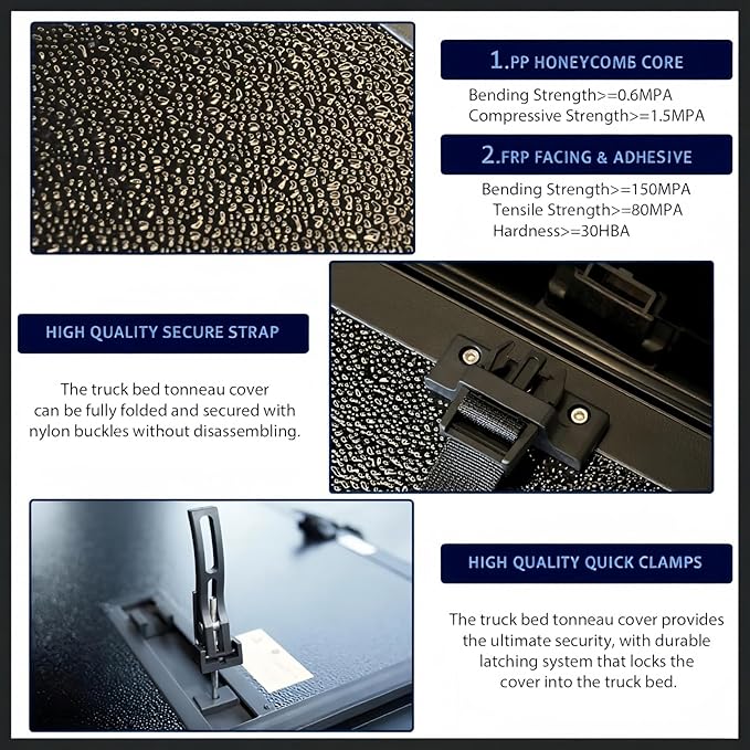 - High-Strength Materials: Constructed with robust fiberglass-reinforced polymer and 6063 T5 aluminum, our tonneau cover offers exceptional strength, supporting 450 pounds. It's impervious to water, UV rays, and chemicals, with a matte black finish to reduce glare. The FRP's hardness (≧30HBa) and compressive strength (≧1.5MPa) outperform aluminum, ensuring a durable, secure fit with a latching system and Velcro straps.