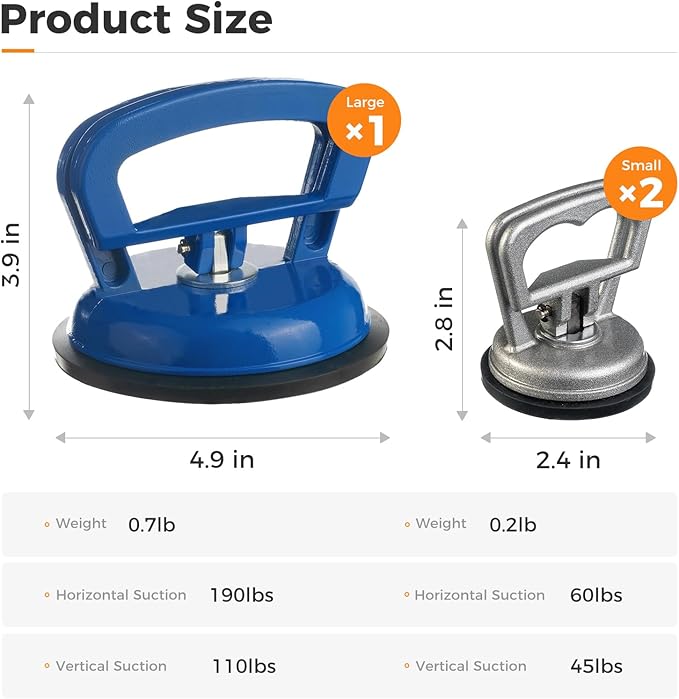 - Super Strong Suction: The large size car dent repair's maximum horizontal suction is 190 lbs, and the maximum vertical suction is 110 lbs. Use the larger puller for more extensive damage, and the smaller one for finer finishing touches.