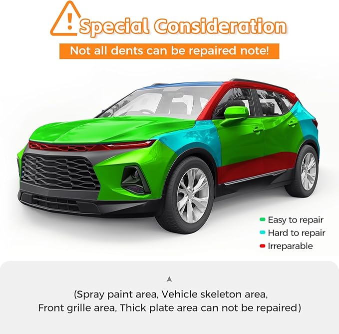 - Easy to Operate: Clean the surface and let paintless dent repair kit dry. Then heat the dent area and adjust the handle of the car dent remover to the detached position. Place the suction cup dent remover on the surface and push down on the air. Finally, quickly pull the double handle to the upward position, you can pull hard on the handle.