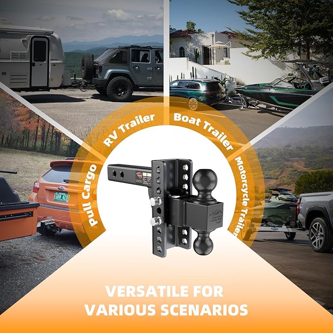 - 【6" ADJUSTABLE & VERSATILE APPLICATION:】- This Adjustable Drop Hitch Offers 9 Height Adjustable Holes with a 6 Inch Drop/6 Inch Rise. And Its Ability to Drop or Rise in 1” Increments Provides the Perfect Fit for Trailers of Different Heights, Without Having to Worry About It Not Sitting Level. Best Ideal for Class III and IV Vehicles Trailer Hitch Recievers. This Drop Hitch is Compatible with Dodge Ram 1500, Jeep Wrangler / Cherokee, Chervrolet Silverado / GMC Sierra 1500, Ford F-150 / Ranger, Toyota 4 Runner / Tundra / Tacoma, Nissan Titan & More.