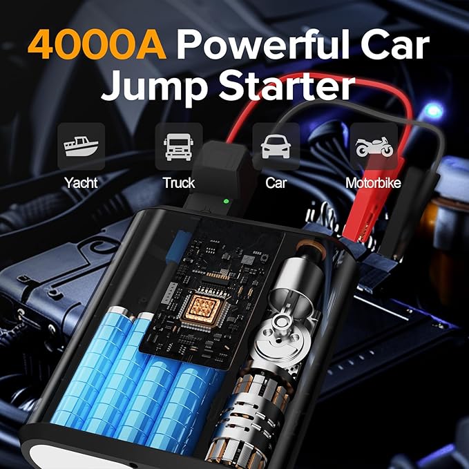 - 4000 Amp Professional Power - Start dead batteries confidently with this car battery jump starter that revives SUVs, trucks, and diesel engines up to 8.0L even after months of sitting unused. The battery jumper starter portable design delivers multiple jumps per charge, replacing old jumper cables while fitting neatly in center consoles - essential car jumper starter portable for winter emergencies or meaningful mens gifts for outdoor adventurers who explore remote locations.