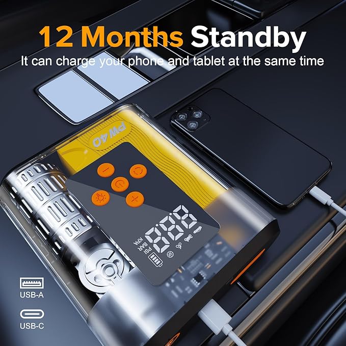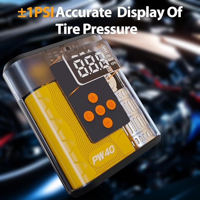 - Smart Digital Inflation System - This jump starter includes a precise tire inflator portable air compressor with 200PSI capacity that automatically stops at your preset pressure for worry-free inflation. From maintaining proper tire pressure for fuel efficiency to inflating sports equipment for weekend games, this tire inflator adapts to every family need - creating thoughtful gifts for dad who teaches car maintenance or practical presents for new drivers learning responsibility.