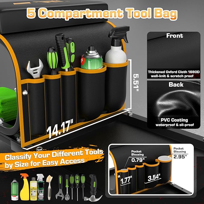 - 5-Compartment Tool Bag: The rolling garage stool has a 5-pocket tool bag, made of heavy-duty 1680D Oxford and PVC coating. Multi-sized pockets hold repair tools, cleaning agents, brushes, etc. Access essential tools in under 5 seconds