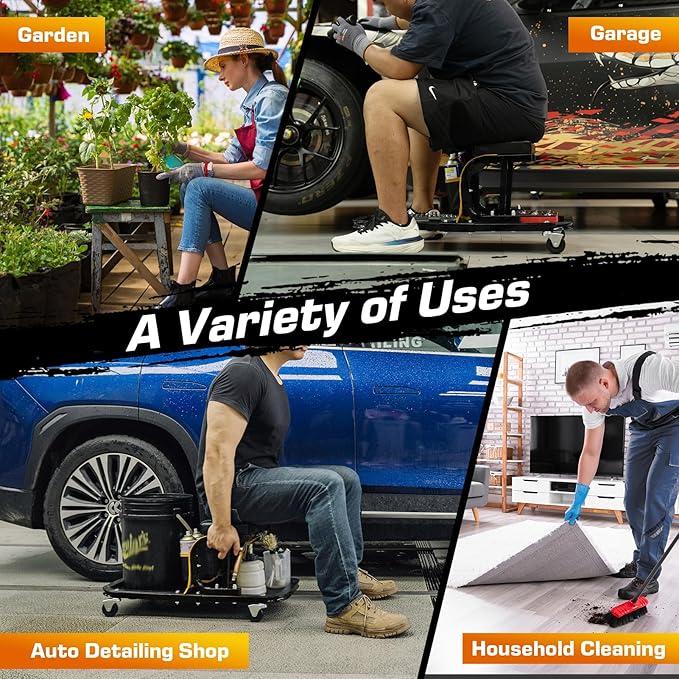 - Various Application: Perfect for car washing/detailing, garage repairs, garden upkeep and household cleaning. Whether tending plants, organizing your garage, or deep-cleaning your car, this auto detailing rolling stool adapts to every task—essential for DIY lovers and pros alike