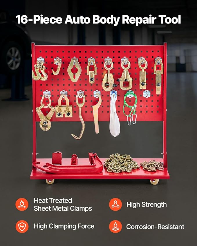 - 16-Piece Straightening Tool Kit: Our auto body frame puller straightener comes with sheet metal clamps and essential tools for car body repair. And a dual-head fixing clamp ensures strong, stable clamping for safety during straightening.
