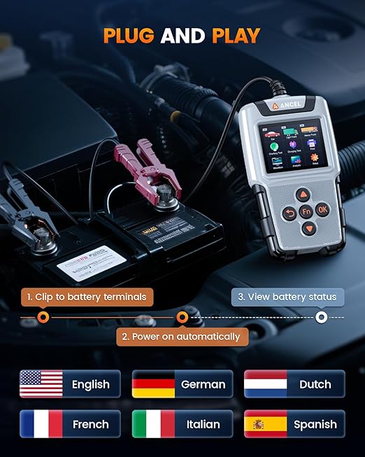 - User-Friendly Design: Enjoy true plug-and-play use with no external charging or battery required. Multi-language support (13 languages including English, Chinese, and German) makes it ideal for global users. Stores up to 1400 test records across battery, cranking, charging, and voltage curve tests for easy review anytime.
