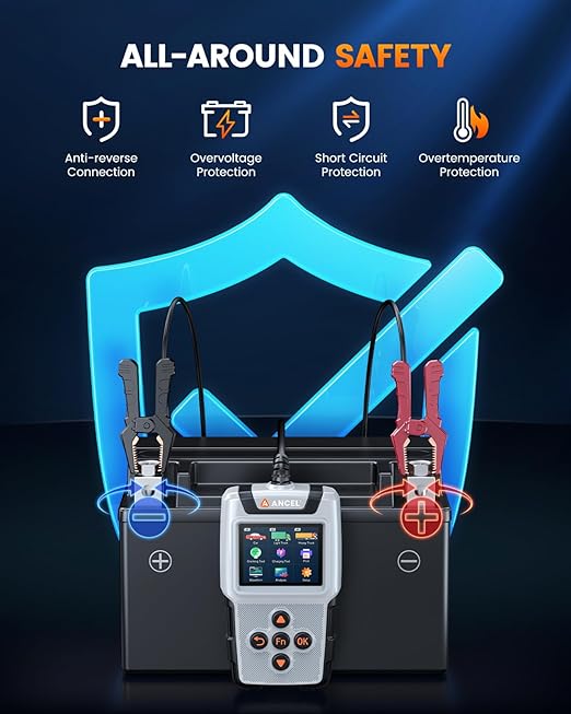 - Safe & Secure Testing: Built-in reverse polarity and short-circuit protection keep both you and your battery safe, even with wrong connections. Upgraded clamps offer a stronger grip and better insulation for worry-free testing.