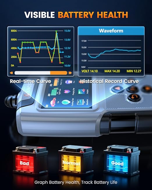 - 3 Essential Tests in Seconds: Battery Health Test checks voltage, CCA, and capacity to reveal battery condition; Cranking Test monitors voltage drop during startup to pinpoint weak batteries or starter issues; Charging Test measures alternator output to detect undercharge or overcharge—giving you a complete diagnostic solution for reliable driving