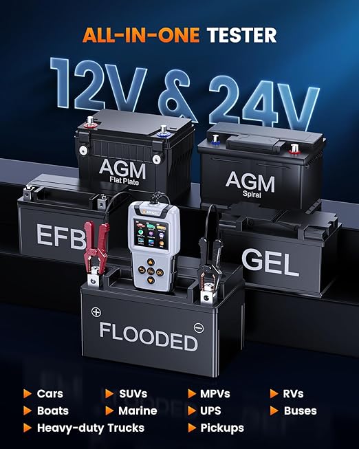 - All-in-one Battery Tester: Effortlessly test 12V&24V lead-acid batteries, providing SOH, SOC, voltage, internal resistance, CCA, and charge data. Compatible with CCA, IEC, EN, SAE, DIN standards and vehicles like cars, 24V trucks, RVs, boats, tractors for optimal performance