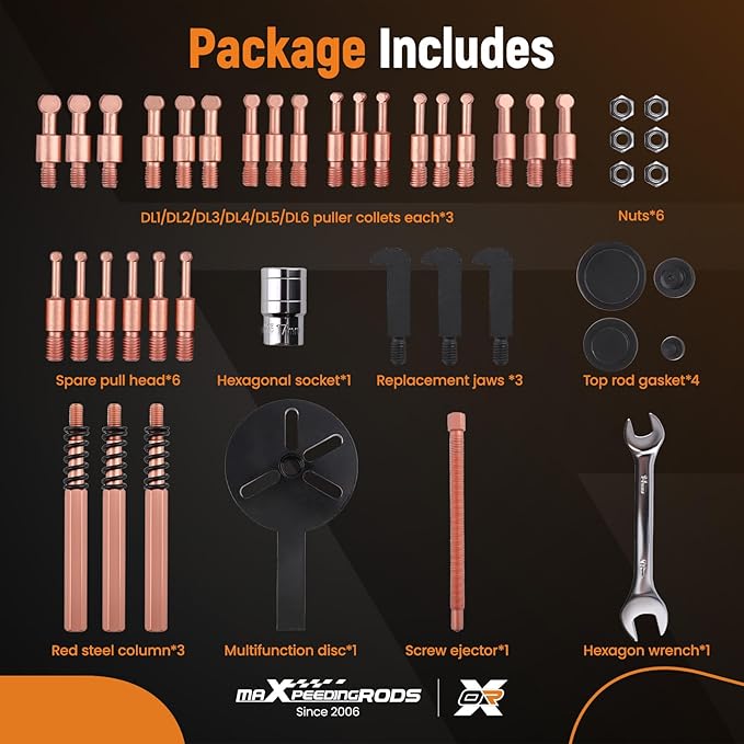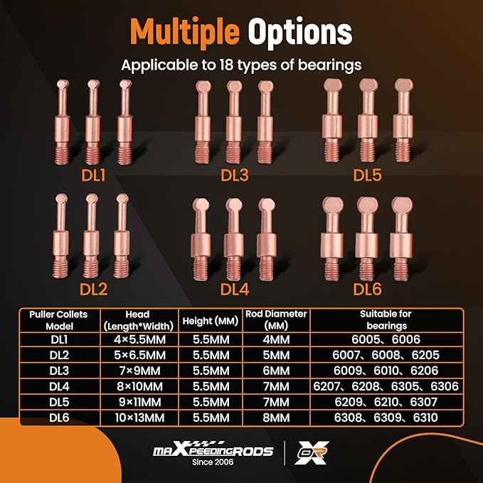 - 36-in-1 Bearing Puller Kit: Comes with 6 different sizes of collets, and an additional 2 sets of the most commonly used puller heads as spares, suitable for bearings of various shapes and sizes. The additional 3 hooks facilitate the removal of more bearings of different specifications. 4 different types of ejector spacers are used to better exert force during the process of pushing out the bearing