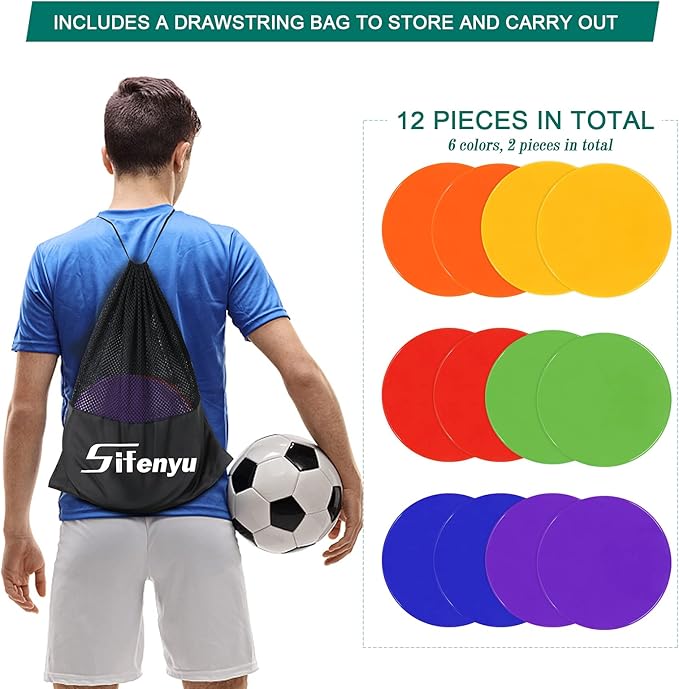 - Mesh Bag: Effortless Storage & Portability - Comes with a durable mesh drawstring bag that keeps all 12 spot markers for gym floor organized and easy to carry. It saves space and prevents moisture buildup—perfect for toting to playgrounds, parks, gyms, or picnics whether you carry it by hand or on your back. No more messy pile!