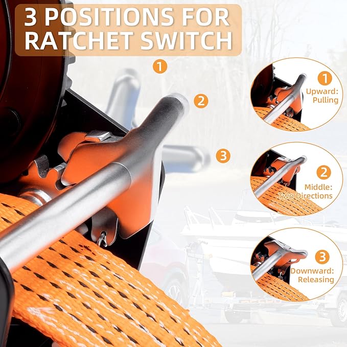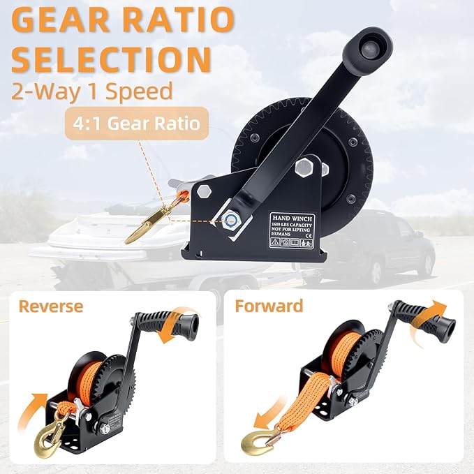 - 【Versatile Two-Way Ratchet】The stainless steel hook with a safety pawl allows for effortless forward and backward ratcheting, enabling you to easily load and unload your boat. With 2-way 1-speed functionality and a powerful 4:1 gear ratio, you can switch winch directions as needed, ensuring smooth and controlled operation while significantly enhancing pulling power. The ratchet switch offers three positions: upward for pulling, middle for two-direction movement, and downward for releasing, providing ultimate control. This versatile feature makes RVSNAIL boat winch perfect for various outdoor towing tasks, allowing you to handle heavy loads with minimal effort.