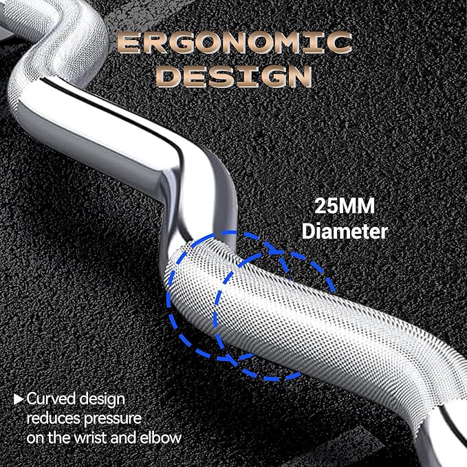 - Ergonomic Design: The Olympic EZ Curl Barbell Bar features a specially curved design that optimally reduces stress on the wrists and elbows, allowing for a comfortable grip during bicep and tricep exercises. This ergonomic approach enhances muscle engagement and ensures precise targeting of the desired muscle groups.