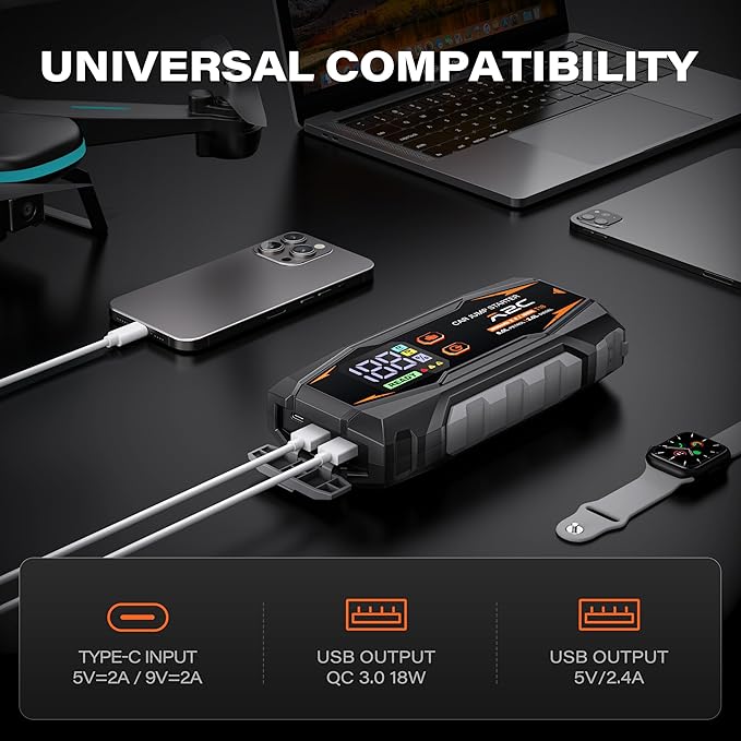 - PORTABLE CAR POWER PACK: More than a car starter jump box, the battery booster jump starter doubles as a car power bank with dual USB outputs (QC18W & 5V/2.4A). It features a lightweight ABS+PC fireproof casing that make it easy to store and carry. Quickly charge smartphones, tablets, iPads, cameras, and other devices. This portable car battery charger and jump starter is ideal for travel, camping, or roadside use. Please note that it is not compatible with vehicles whose battery voltage is below 2V.