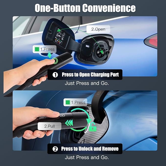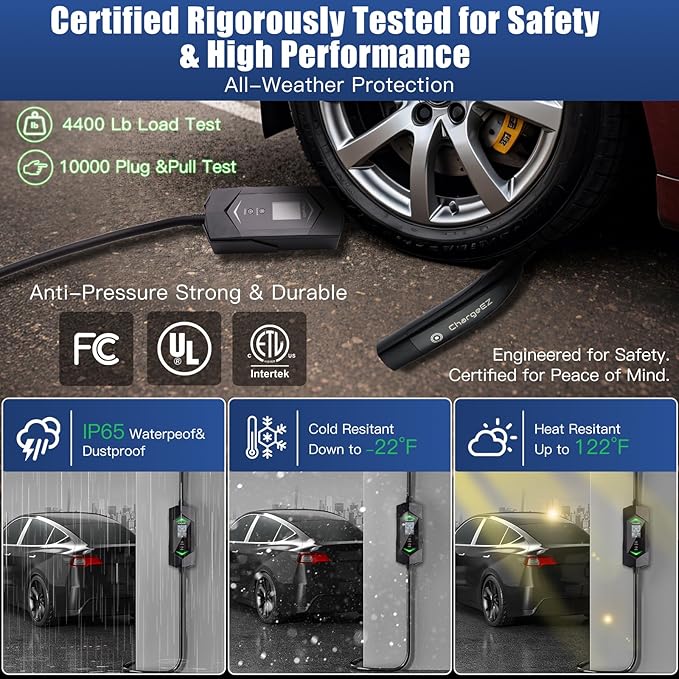 - One-click open makes charging effortless – no complicated setup! Includes a sleek soft carry case & pad for easy storage. Perfect for Tesla Model Y, Model 3, and all NACS compatible EVs. Your ultimate Tesla home charger solution with FCC/UL/ETL certification!