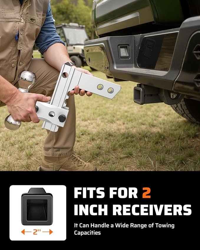 - FITS 2-INCH RECEIVER WITH 6'' DROP/RISE FOR VERSATILE TOWING SOLUTIONS: Adjustable in 1 inch increment making it versatile and adaptable for different towing needs. With a 2-inch (8000 LBS) and 2-5/16 inch (12,500 LBS GTW) ball hitch options, it can handle a wide range of towing capacities with unmatched ease and stability