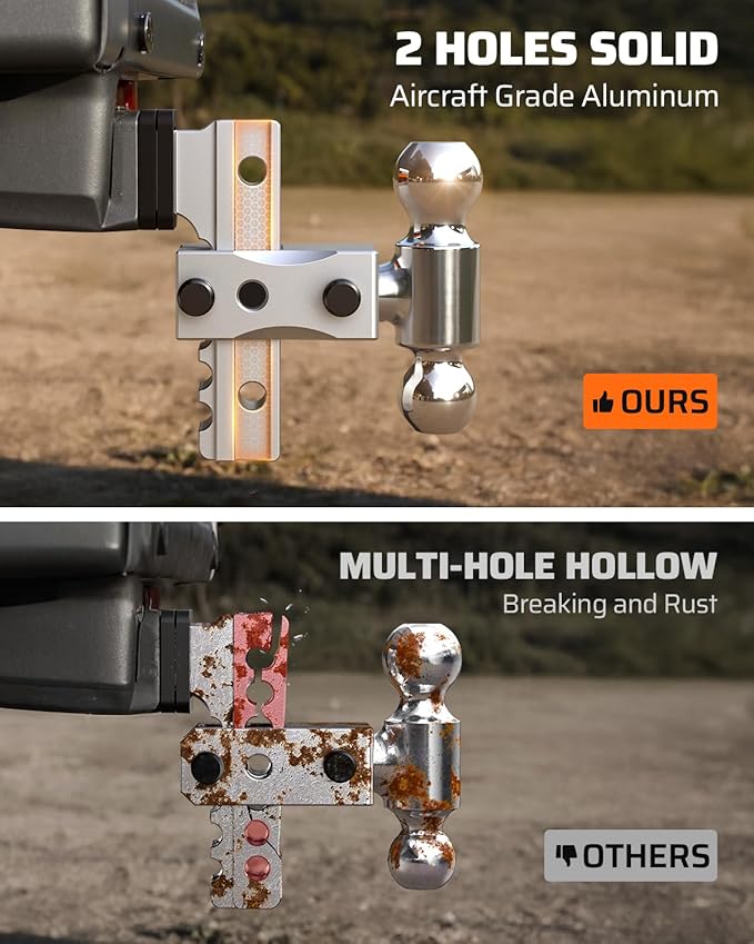 - SOLID STRUCTURE DESIGN: The adjustable trailer hitch is crafted from premium AVIATION GRADE aluminum with Advanced Oxide Materials and designed by our professional R&D team! It's hitch shank owns only 2 holes and the middle part of them are solid, which is stronger to improve the structural strength and ensure better towing load-bearing capacity, and will not break easily