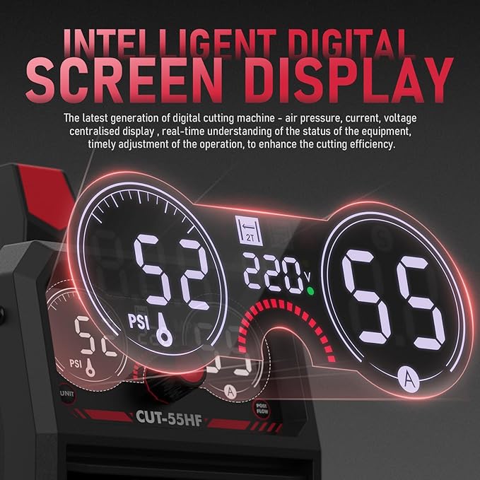 - POWERFUL CUTTING CAPACITY: Featuring a 55A current output, it delivers deep cutting thickness. Ideal clean cut: 3/10''@110V,1/2''@220V, max cut: 3/5''@110V,4/5''@220V. Uses non-hazardous compressed air to cut stainless steel, alloy steel, mild steel, copper, and aluminum.