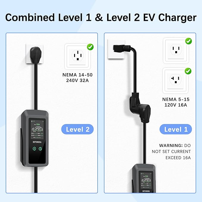 - Easy Installation & Safety Reminder: No professional wiring required. Includes NEMA 14-50 and NEMA 5-15 plugs for 110V–240V outlets, supporting Level 1 & 2 charging up to 32A. The 25-ft cable ensures flexible reach at home, camping, or on the road. Always use the original adapter to prevent overload, short circuits, or damage. When using the 5-15 plug, set the current to 16A or lower for safe operation.