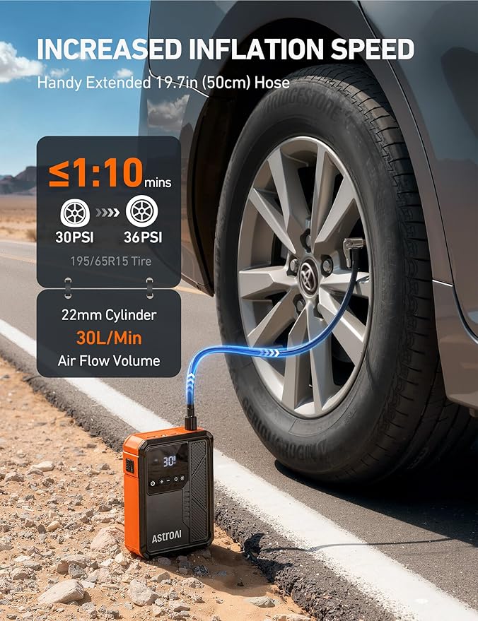 - 150PSI TIRE INFLATOR: Never struggle to reach tire valves on large vehicles. Our extended 19-inch hose lets you inflate all four tires without moving the compressor. The high-flow design fills a 195/65R15 tire from 0 to 36 PSI in about 5:30mins, while the Auto-Shutoff function lets you "set it and forget it," preventing over-inflation and protecting your tires.