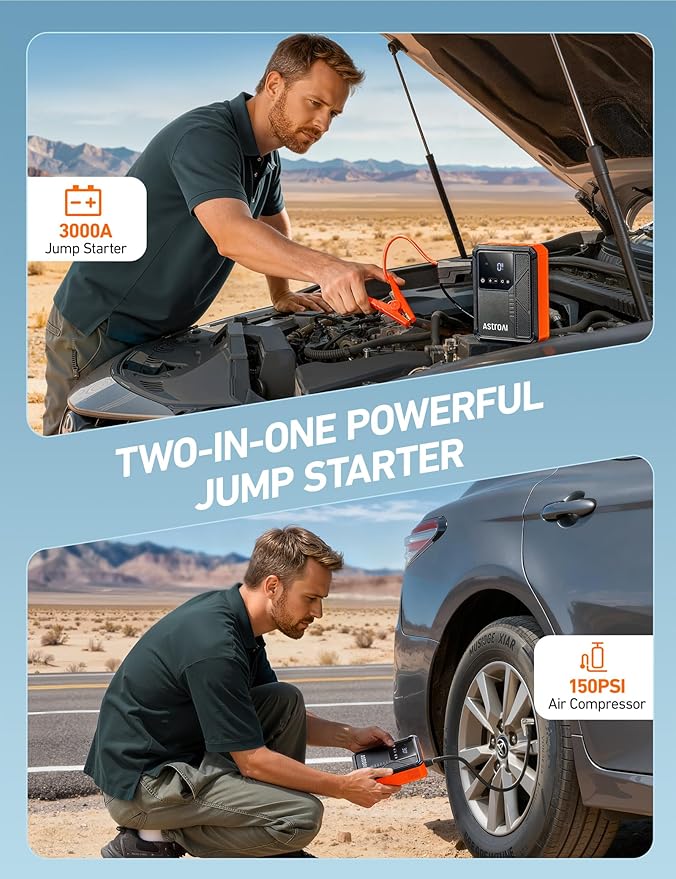 AstroAI Beta822 3000A Jump Starter with Air Compressor, 150PSI Portable Tire Inflator with Auto-Shutoff, 12V Car Battery Booster (9.0 Gas/7.0L Diesel) with LED Light and Jumper Cables