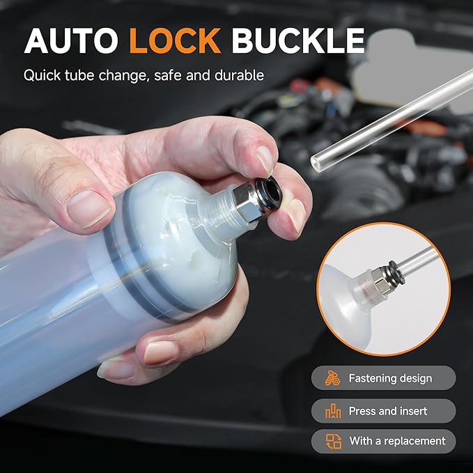 - QUICK CONNECTION: Oil syringe with a lock buckle that can be inserted and disconnected with a gentle press, convenient and fast to extract the oil. It also comes with a spare buckle for replacement when the original is loose