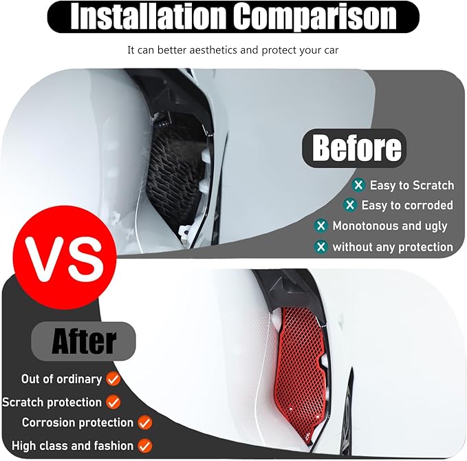 - Easy Installation:The Side Intake Mesh Grilles Insert Set Accessories installation is simple, no drilling is required, just remove the screws of the protective plate front intake grille vent, it can be installed in just a few minutes without affecting any operation of the car (For specific installation instructions, please refer to the installation video on the red model's details page.)