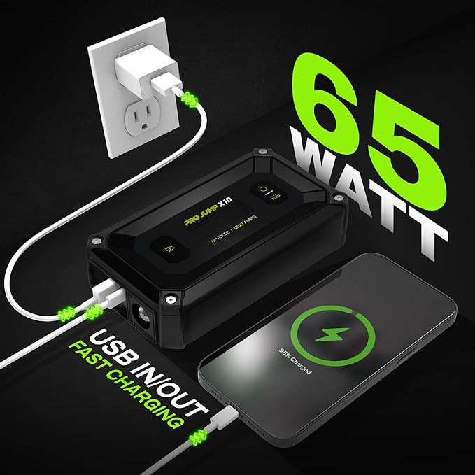 - 65W USB-C FAST CHARGING & 10,000mAh POWER BANK - Equipped with a true 65W USB-C output, the X10 isn’t just for cars—it’s a high-speed portable charger. Quickly power up laptops, drones, phones, and tablets from its massive 10,000mAh battery.
