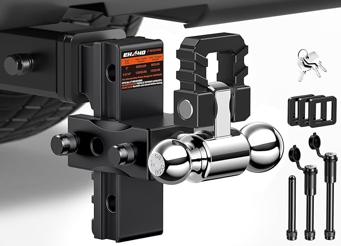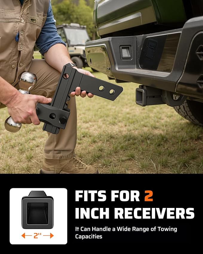 - FITS 2 INCH RECEIVER WITH 6'' DROP/RISE FOR VERSATILE TOWING SOLUTIONS: Adjustable in every 1 inch increment making it versatile and adaptable for different towing needs. With a shackle (14430 LBS) , 2 inch (8000 LBS) and 2-5/16 inch (12,500 LBS GTW) ball hitch options, it can handle a wide range of towing capacities with unmatched ease and stability