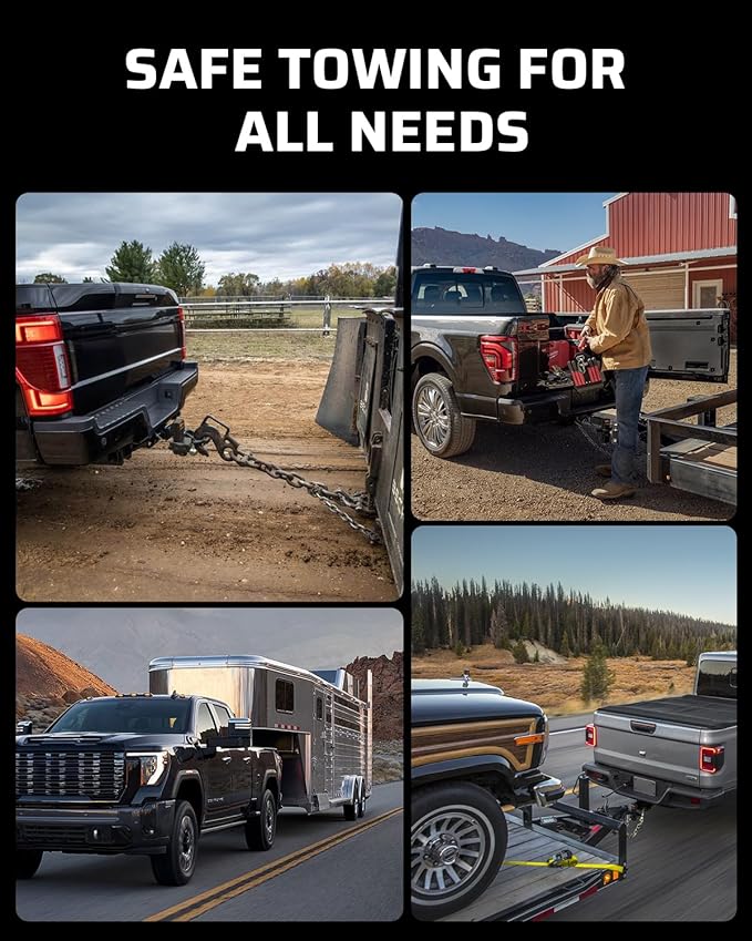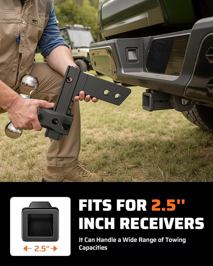 - FITS 2.5 INCH RECEIVER WITH 6'' DROP/RISE FOR VERSATILE TOWING SOLUTIONS: Adjustable in every 1 inch increment making it versatile and adaptable for different towing needs. With a 2 inch (8000 LBS) and 2-5/16 inch (18,500 LBS GTW) ball hitch options, it can handle a wide range of towing capacities with unmatched ease and stability