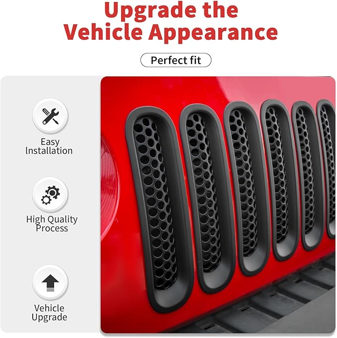 - Perfect Fitment-- These grill insert is compatible with Jeep Wrangler JK JKU 2007 2008 2009 2010 2011 2012 2013 2014 2015 2016 2017 2018. Please verify that it is suitable for your vehicle.