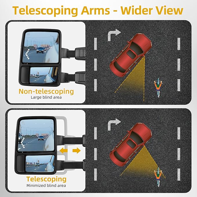 - Advanced Functionality:Power-adjustable plane mirror for customized visibility. Power heated plane mirror ensure clarity in cold weather. With manually adjustable convex lens, halogen lights, manual telescoping and manual folding,this side mirrors provides you with wider view