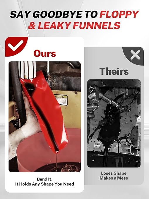 - 【Say Goodbye to Leaks and Mess】Our metal bendable spout funnel features a tightly threaded connection for a leak-proof seal, and our flexible funnel locks in any shape you need. Each is designed to eliminate spills at the source by guiding oil precisely where it should go, keeping your garage floor clean and safe