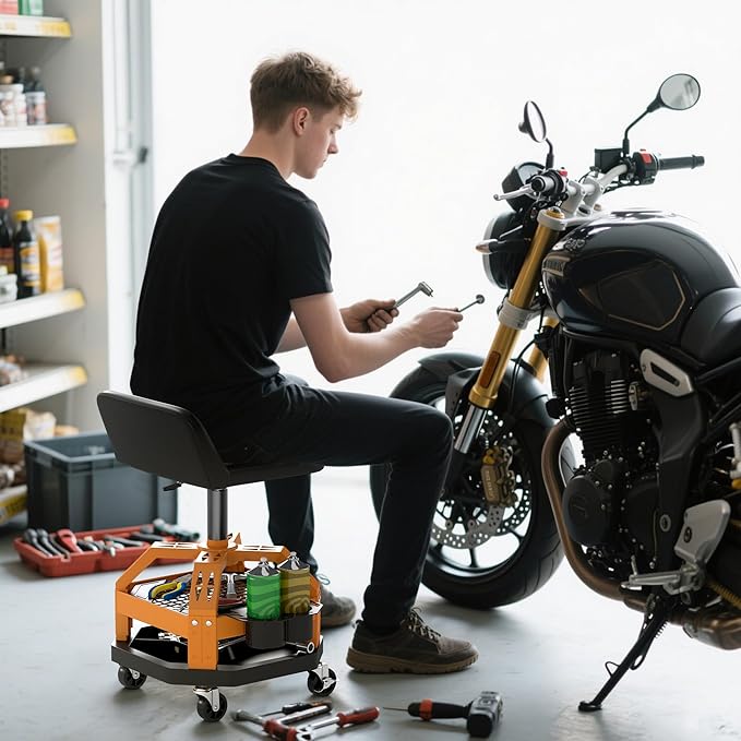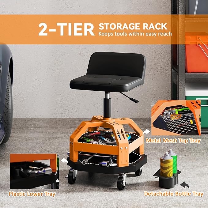 - 2-Tier Storage Tray with Bottle Holder: This garage chair features a dual-tier storage tray with a removable side bottle holder, keeping everything you need within reach, such as wrenches, screwdrivers, lubricant spray, and more