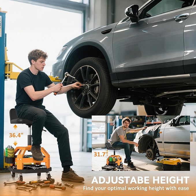 - 31.7"-36.4" Adjustable Height: This rolling creeper seat features pneumatic height adjustment from 31.7" to 36.4" for middle height tasks, allowing you to find the right position for your height and working needs, reducing stress on your back and knees