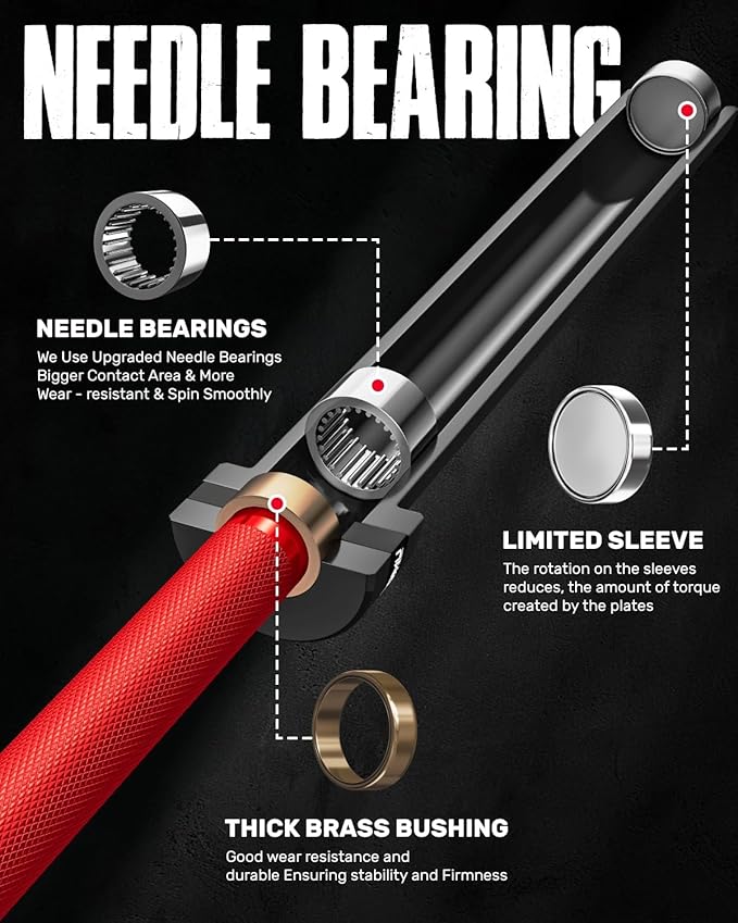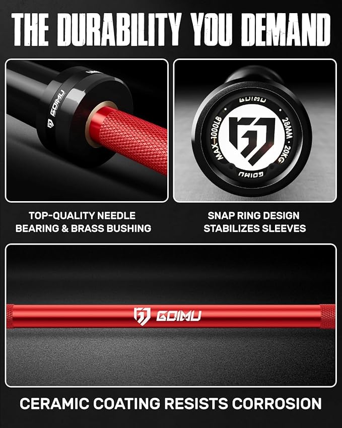 - 【Premium Bearings and Bushings】GOIMU Olympic barbell sleeves feature a system of silent needle bearings + brass bushings + limit sleeves. The sleeves rotate smoothly, effectively reducing pressure on wrists and forearms, protecting joints, and allowing you to train long-term without strain.