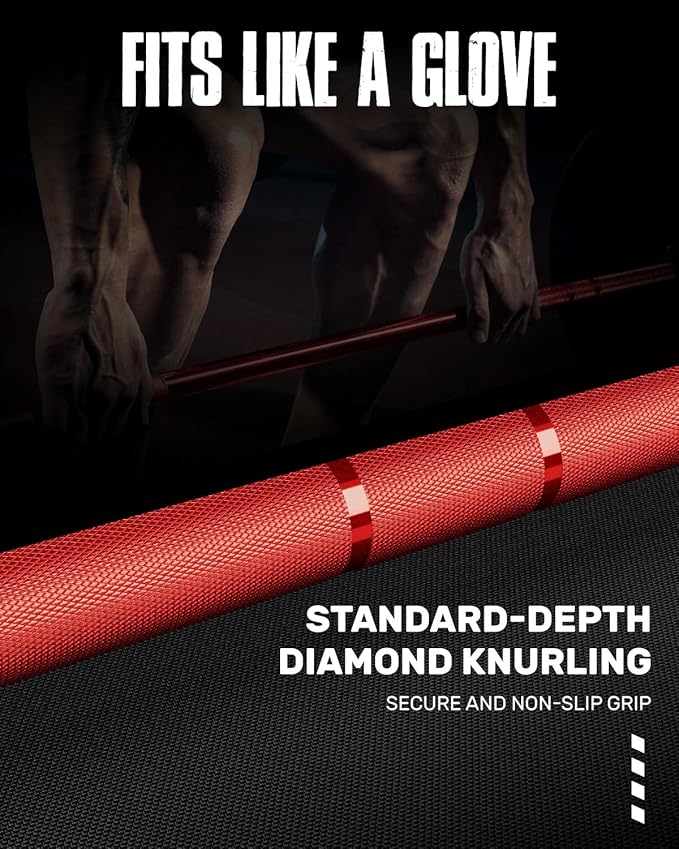 - 【Grip. Lift. Dominate.】The barbell adopts a dual-marking knurl design, clearly indicating the correct grip positions for both powerlifting and Olympic weightlifting. The 1.2mm diamond knurling on the surface not only ensures a secure grip but also mitigates the impact of sweating, preventing a drop in friction.
