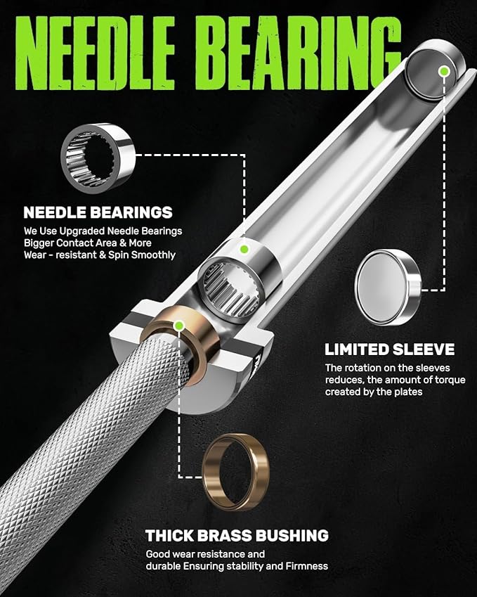 - 【Premium Bearings and Bushings】GOIMU Olympic barbell sleeves feature a system of silent needle bearings + brass bushings + limit sleeves. The sleeves rotate smoothly, effectively reducing pressure on wrists and forearms, protecting joints, and allowing you to train long-term without strain.