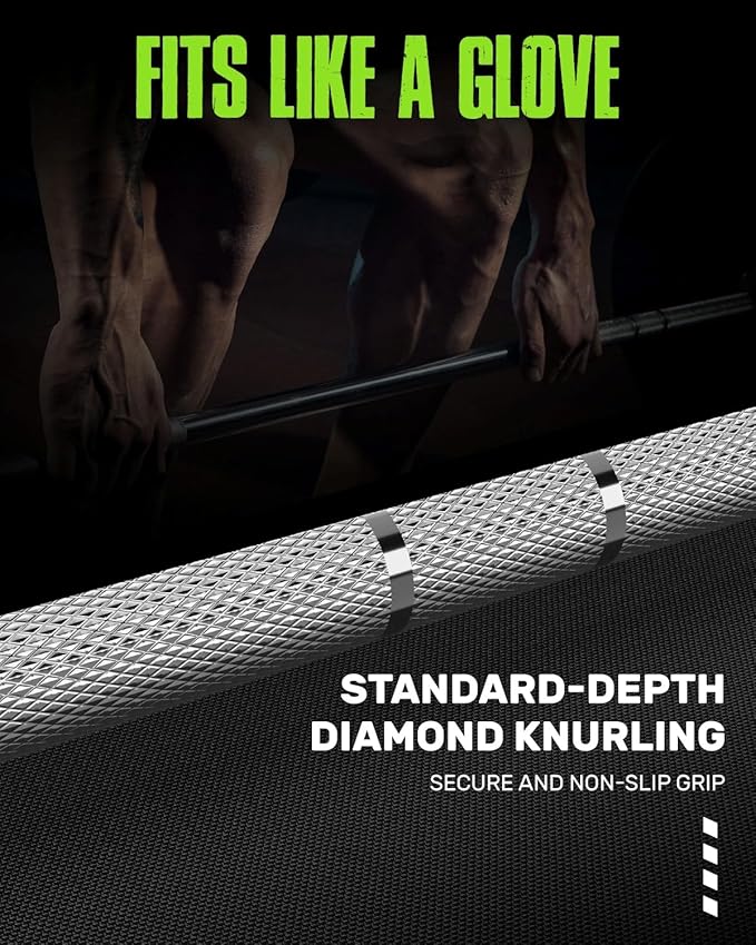 - 【Grip. Lift. Dominate.】The barbell adopts a dual-marking knurl design, clearly indicating the correct grip positions for both powerlifting and Olympic weightlifting. The 1.2mm diamond knurling on the surface not only ensures a secure grip but also mitigates the impact of sweating, preventing a drop in friction.