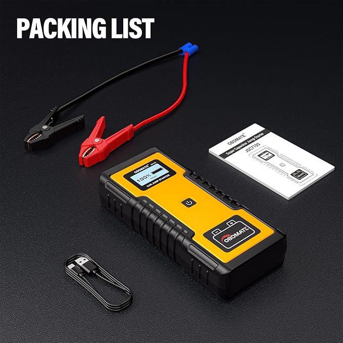 - 【Super Capacitor Jump Starter】 OBDMATE JSC7100 is a battery-free capacitor jump starter engineered to deliver instant cranking power for gasoline and diesel engines. Unlike conventional battery-based boosters, it requires no precharging and does not retain power for extended periods.