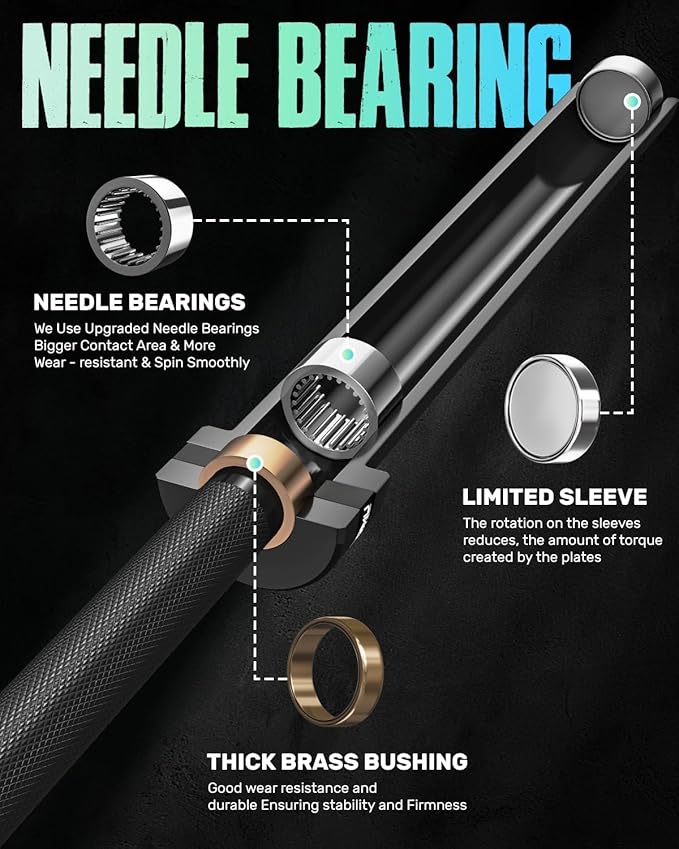 - 【Premium Bearings and Bushings】GOIMU Olympic barbell sleeves feature a system of silent needle bearings + brass bushings + limit sleeves. The sleeves rotate smoothly, effectively reducing pressure on wrists and forearms, protecting joints, and allowing you to train long-term without strain.