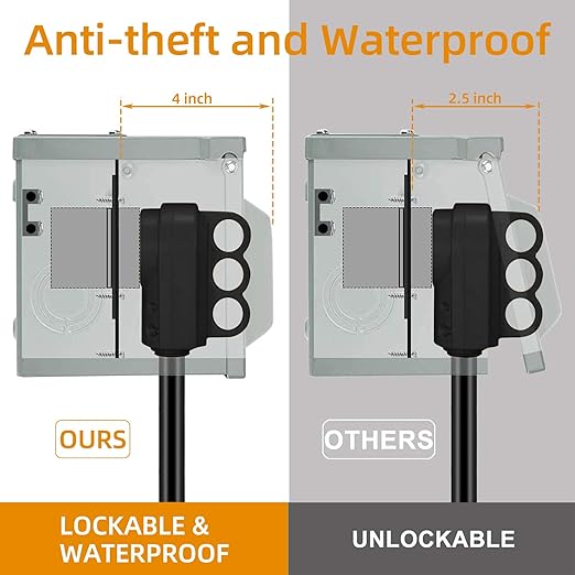 - Weatherproof&Anti-Theft: Our 50 Amp power outlet box is constructed of heavy duty metal for durability and protecting the power outlet from element; Doors can be locked to prevent power theft and anyone disconnecting the service. Now you can power your EV, RV, generator, welder, electric stoves ect. outside in a safe and reliable way