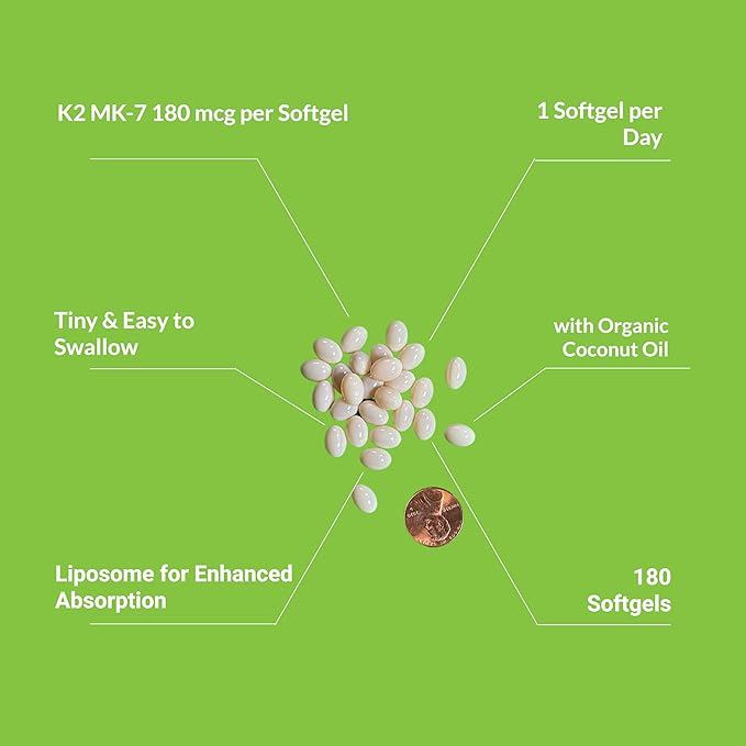 - 180 Vitamin K2 MK-7 Mini Softgels - 1 bottle contains 180 mini sofgels with 180mcg MK7 in each softgle. The softgel is smaller than a pea. Our vit k2 supplement is super easy to swallow for anyone.